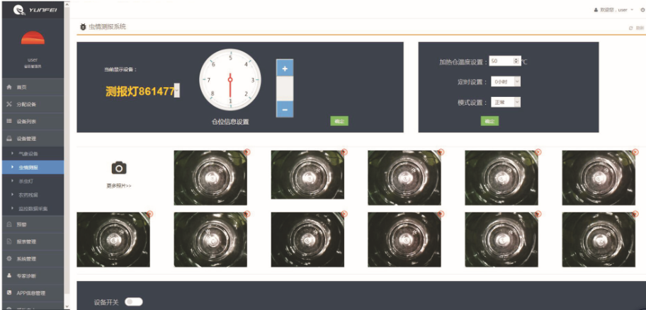 遠(yuǎn)程蟲情分析測(cè)報(bào)儀利用現(xiàn)代光、電、數(shù)控技術(shù),實(shí)現(xiàn)了在無人監(jiān)管的情況下,能自動(dòng)完成誘蟲、殺蟲、收集、分裝、排水等系統(tǒng)作業(yè),通過GPRS移動(dòng)無線網(wǎng)絡(luò),定時(shí)拍照采集接蟲盒內(nèi)收集的蟲體圖片,自動(dòng)上傳到遠(yuǎn)程物聯(lián)網(wǎng)監(jiān)控平臺(tái),平臺(tái)每天自動(dòng)記錄采集數(shù)據(jù),形成蟲害數(shù)據(jù)庫(kù),可以通過數(shù)據(jù)列表和圖表的形式展現(xiàn),工作人員可隨時(shí)遠(yuǎn)程了解以蟲體的情況和變化,制定防控措施。